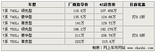 據(jù)4S店銷售人員介紹:目前新7系現(xiàn)車較少,大部分需要預(yù)訂。最快預(yù)定時間為2周左右,最長需等3個月以上。目前店內(nèi)只有740Li領(lǐng)先型少量現(xiàn)車,,顏色有黑色及灰色。在優(yōu)惠政策方面,740Li系列可以打9.2折,750Li系列可以打9.8折,喜歡的朋友可以到店內(nèi)洽談。