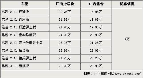 今年的7月8日,別克終于推出了帶著家族新元素特征的中級車市場的又一力作-新君越。新君越的加入無疑給別克軍團(tuán)再次打了一針“興奮劑”,其與新君威形成了很好的市場互補(bǔ)。別克經(jīng)銷店已經(jīng)可以接受新君越的預(yù)訂工作,訂金為10萬元,并且為了清理老款君越的庫存車,老君越出現(xiàn)了全系降4萬元的優(yōu)惠,具體價(jià)格請看下表: