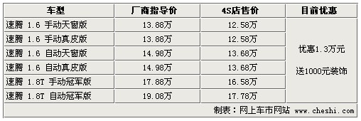 據(jù)4S店銷售人員介紹:目前速騰全系優(yōu)惠1.3萬元,較之前優(yōu)惠幅度有所增加,如在店內(nèi)做一條龍服務(wù)還可獲贈(zèng)價(jià)值1000元的裝飾,裝飾主要包括腳墊、座套等。由于2.0升車型停產(chǎn),所以目前只有1.6升和1.8TSI車型。1.6升車型更注重經(jīng)濟(jì)型,而1.8TSI更加注重動(dòng)力表現(xiàn)。