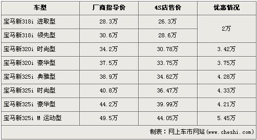 新寶馬3系在去年12月份正式在國內(nèi)市場正式上市銷售,經(jīng)過改款后的3系從外觀的流線,到內(nèi)飾的風(fēng)格均有一定程度的變化,帶給消費(fèi)者的是全新的視覺沖擊和駕馭樂趣。根據(jù)網(wǎng)上車市價(jià)格監(jiān)測系統(tǒng)顯示,新寶馬3系車型全系出現(xiàn)了不同的現(xiàn)金優(yōu)惠,最高優(yōu)惠達(dá)到了5.45萬元,具體車型價(jià)格如下: