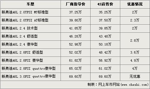 據(jù)銷(xiāo)售人員介紹,目前奧迪A6L全系可以最高優(yōu)惠4.9萬(wàn)元。奧迪A6L全系分為2.0T FSI,2.4L,2.8 FSI,3.0 FSI四種共10個(gè)車(chē)型,最低配的2.0TFSI標(biāo)準(zhǔn)型經(jīng)2萬(wàn)元優(yōu)惠后售價(jià)降到了35.25萬(wàn)元,而2.8FSI 豪華版經(jīng)全系最高的4.9萬(wàn)元優(yōu)惠后售價(jià)也降到了56.92萬(wàn)元。全系最高配的3.0FSI quattro豪華版目前店內(nèi)沒(méi)有現(xiàn)車(chē),欲購(gòu)買(mǎi)的消費(fèi)者需要交1萬(wàn)元訂金,約等3個(gè)月后方可提車(chē)。