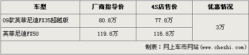 在今年,英菲尼迪FX系列上市了兩款車型,一個是以新成員身份加入的FX50,售價為119.5萬元。另一個是FX35的改款車型-09款FX35,售價為80.8萬元。隨著兩款新車的上市,老款的FX35和FX45都已停止了進口。近日據網上車市價格監(jiān)測系統(tǒng)顯示,英菲尼迪全系出現(xiàn)了3萬元的優(yōu)惠,具體詳情請看下表: