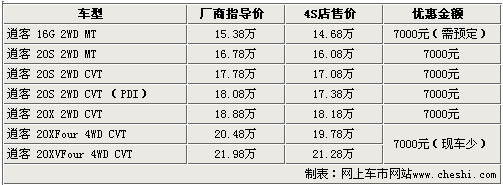 東風(fēng)日產(chǎn)推出的逍客車型是在國(guó)內(nèi)第一款真正意義上的跨界車,這款車既擁有SUV的時(shí)尚外觀和通過(guò)性,又有轎車的舒適性和省油優(yōu)勢(shì)。根據(jù)網(wǎng)上車市價(jià)格監(jiān)測(cè)系統(tǒng)顯示,目前在北京地區(qū)購(gòu)買逍客的消費(fèi)者,可以享受到全系7000元的現(xiàn)金優(yōu)惠,但是1.6L車型需預(yù)定。具體車型以及價(jià)格如下: