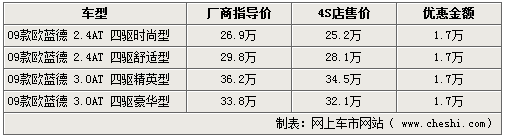 歐藍德是三菱汽車第一款采用轎車底盤形式生產的SUV,沿用了三菱Lancer(藍瑟)轎車的平臺,具有轎車乘坐的舒適性,同時它又有SUV的特性。根據網上車市價格檢測系統(tǒng)顯示,目前歐藍德車型主要為09款車型,最高讓利達1.7萬元。具體車型以及價格如下: