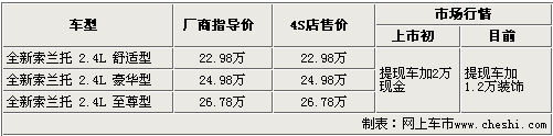 起亞進口SUV全新索蘭托于7月29日正式上市銷售,前期推出了三款車,售價為22.98萬——26.78萬元。據(jù)網(wǎng)上車市價格監(jiān)測系統(tǒng)顯示:目前北京地區(qū)進口起亞4S店內(nèi)無現(xiàn)車銷售,急于提現(xiàn)車的消費者在店內(nèi)購買1.2萬元的裝飾后,即可在本周提到愛車,而預訂則需要等待一個月左右。