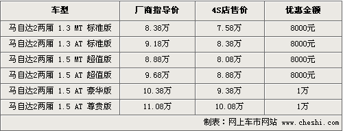 長安馬自達2系列車型在推出后備受關(guān)注,尤其兩廂車靈活多變的車身顏色和流線型的外觀非常惹人喜愛,三廂車總體的空間上也能滿足普通家庭出行的需要,是經(jīng)濟型轎車中的一款精品。目前筆者了解到,馬自達2系列最高優(yōu)惠幅度已經(jīng)過萬,具體車型以及價格如下列表: