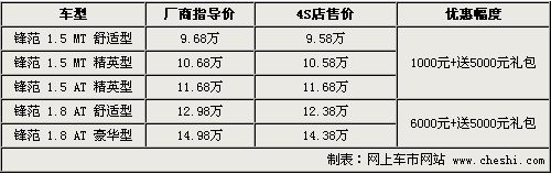 廣汽本田鋒范自上市以來,以全新的造型得到了消費者的極大關(guān)注,隨著同級別競爭車型的不斷推出,鋒范在價格上也出現(xiàn)了松動,其中1.8L最高優(yōu)惠幅度達(dá)到了6000元,同時還有購車送禮的活動推出,具體行情如下: