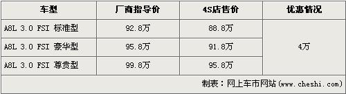 據(jù)北京奧迪經(jīng)銷店銷售人員介紹,目前奧迪A8L的3.0L車型有4萬元的優(yōu)惠。經(jīng)優(yōu)惠后,3.0L標(biāo)準(zhǔn)型的售價從92.8萬下降到了88.8萬元,3.0L豪華型的售價從95.8萬元下降到了91.8萬元,3.0L尊貴型的售價也從99.8萬元下降到了95.8萬元。銷售人員還介紹,店內(nèi)目前沒有現(xiàn)車,欲購買的消費者需交2萬元訂金,本月月底可提車。