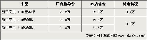 甲殼蟲是一款出自于PQ34平臺的轎車,它與我們熟知的高爾夫共平臺生產(chǎn)。不過在國內(nèi),它的“身份”卻被提升了很多,絕對的超過高爾夫的價格。正因這是一款小眾車型,所以它顯得彌足珍貴,再加上甲殼蟲圓潤、小巧、動感的外形,所以它給我們的印象非常親切。近日據(jù)網(wǎng)上車市價格系統(tǒng)監(jiān)測顯示,甲殼蟲出現(xiàn)了最高3.7萬元的優(yōu)惠,具體價格詳情請看下表: