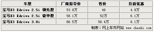 繼X5成功的引進(jìn)我國(guó)后,寶馬又將其X系列旗下的緊湊型SUV寶馬X3帶到了中國(guó)。目前國(guó)內(nèi)在售的X3 2.5Si與X3 3.0si是在X3基礎(chǔ)上衍生而成的運(yùn)動(dòng)版車型,將寶馬特有的靈敏性與運(yùn)動(dòng)型多用途車的廣泛實(shí)用性完美結(jié)合。近日據(jù)網(wǎng)上車市價(jià)格數(shù)據(jù)監(jiān)測(cè)顯示,寶馬X3全系最高有近8.1萬(wàn)元的現(xiàn)金優(yōu)惠,具體詳情請(qǐng)看下表: