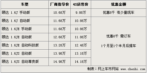 據(jù)東風(fēng)日產(chǎn)4s店銷售人員介紹,目前頤達(dá)全系車型現(xiàn)金優(yōu)惠8千元。經(jīng)優(yōu)惠后,入門(mén)級(jí)的1.6J 手動(dòng)版車型售價(jià)從10.68萬(wàn)元下降到了9.88萬(wàn)元,高配的1.6JS 自動(dòng)尊貴型售價(jià)也下降到了14.18萬(wàn)元。北京地區(qū)4S店目前只有個(gè)別1.6J時(shí)尚版車型,其他款車型無(wú)現(xiàn)車,欲購(gòu)買者需交1000元訂金約等1個(gè)月至1個(gè)半月的時(shí)間。北京地區(qū)各4S店由于訂單不同,各店銷售的現(xiàn)車顏色有所不同。