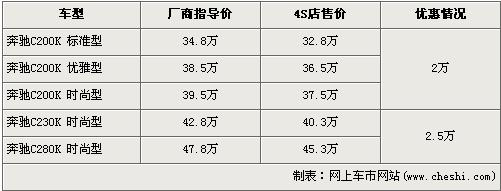 奔馳C級(jí)轎車一直就是奔馳里最暢銷的車型,它的總銷量占到了奔馳總銷量的三分之一。目前,國(guó)內(nèi)銷售的奔馳C級(jí)轎車是去年新上市的全新C級(jí)車型,全系分為C200K、C230和C280三種類別共5款車型,售價(jià)區(qū)間為34.8萬(wàn)元-47.8萬(wàn)元。近日據(jù)北京奔馳經(jīng)銷店銷售人員介紹,目前奔馳C級(jí)全系最高優(yōu)惠2.5萬(wàn)元,具體詳情請(qǐng)看下表:
