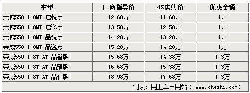 1.8L榮威550上市已經(jīng)有段時(shí)間了,隨著廠家產(chǎn)能的逐步提升,各家4S店的貨源問(wèn)題早已得到解決。據(jù)網(wǎng)上車(chē)市網(wǎng)站了解,目前北京地區(qū)的榮威4S店里的1.8T現(xiàn)車(chē)比較充裕,而1.8L車(chē)型的優(yōu)惠力度也逐步加大,近期分別有1萬(wàn)到1.3萬(wàn)元的優(yōu)惠。具體詳情如下: