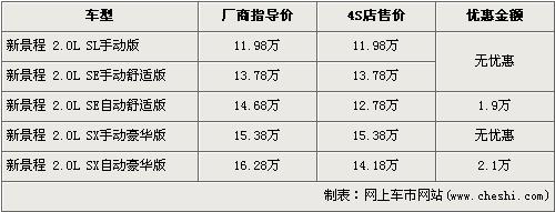 根據(jù)北京雪佛蘭4S店銷售人員介紹,由于2010款新景程將要上市,所以在款的景程已經(jīng)停產(chǎn),并且店內(nèi)已沒有手動(dòng)擋現(xiàn)車,自動(dòng)檔現(xiàn)車數(shù)量有限。經(jīng)1.9萬元優(yōu)惠后,2.0L自動(dòng)舒適版的售價(jià)降到了12.78萬元,2.0L自動(dòng)豪華版經(jīng)2.1萬元優(yōu)惠后售價(jià)也降到了14.18萬元。