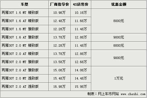 東風(fēng)標(biāo)致旗下的“大嘴”307,自在08年上市至今得到了消費(fèi)者的一直認(rèn)可和喜愛(ài)。根據(jù)網(wǎng)上車(chē)市價(jià)格監(jiān)測(cè)系統(tǒng)顯示,東風(fēng)標(biāo)致將于9月17日正式推出新款標(biāo)致307,同時(shí)老款優(yōu)惠幅度進(jìn)一步加大。具體車(chē)型以及價(jià)格如下: