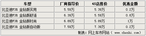 比亞迪F3R在推出金鉆版系列車型之后,受到很多消費者的關(guān)注與喜愛。金鉆版比亞迪F3R車型增加到了3款,全系售價區(qū)間為5.59萬元-7.59萬元。網(wǎng)上車市網(wǎng)站了解到,近日比亞迪F3R時尚型最高可優(yōu)惠10000元,其他車型也可優(yōu)惠2000到8000元不等。詳情如下: