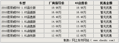 2010款榮威550上市后,隨著廠家產能的逐步提升,各家4S店的貨源問題早已得到解決。據網上車市網站了解,目前北京地區(qū)的榮威4S店里的550全系現車比較充裕,暫時沒有現金優(yōu)惠,而老款車型各店已經基本售空。具體詳情如下:
