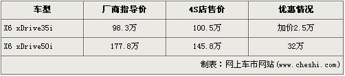 據(jù)北京寶馬經(jīng)銷店銷售人員介紹,現(xiàn)在在售的X6車型分為售98.3萬元的35i車型和售價(jià)為177.8萬元的50i兩款車型。目前購買35i車型的消費(fèi)者沒有優(yōu)惠,提現(xiàn)車還要加價(jià)2.5萬元,售價(jià)從98.3萬元上升到了100.8萬元,排量更大的4.4升的50i車型有32萬元的現(xiàn)金優(yōu)惠,售價(jià)降到了145.8萬元。銷售人員還介紹,近期50i車型車型沒有現(xiàn)車,消費(fèi)者需交訂金10萬元,下個(gè)月可提車。