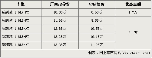 據(jù)4S店銷售人員介紹,新凱越分為1.6L與1.8L兩種排量車型,目前新凱越除了入門級的1.6LX-MT版優(yōu)惠1.7萬外,其他車型均優(yōu)惠2.1萬元。經(jīng)優(yōu)惠后,全系的最低價格降到了8.68萬元。銷售人員還介紹,新凱越店內(nèi)現(xiàn)車比較充足,消費者挑選的空間較大。