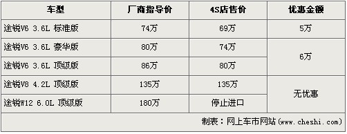 途銳是大眾首款引進(jìn)我國的SUV車型,在3.6L及4.2L率先上市后,大眾為了滿足消費(fèi)者的更大胃口,緊接著又推出了搭載12缸發(fā)動機(jī)的6.0L車型。隨著大排量消費(fèi)稅的頒布,給9月份后入關(guān)的大排量車型帶來了一次不小的沖擊,令大排量汽車價格都上調(diào)了不少。近日據(jù)網(wǎng)上車市價格系統(tǒng)監(jiān)測顯示,大眾途銳的6.0L車型已經(jīng)停止進(jìn)口,并且購買目前購車可以得到最高6萬元的優(yōu)惠,具體詳情請看下表: