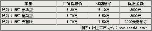酷熊作為長城汽車在市場上推出的第三款轎車產品,憑借極具個性的造型和寬大的內部空間,使很多消費者都對其非常感興趣。新車價格分別為豪華型6.39萬元、精英型6.79萬元,天窗版7.79萬元。近日,網上車市網站了解到,長城汽車4S店處的天窗版酷熊仍然處在無車銷售的狀態(tài),其他兩款車型有現車銷售,可以給出2千元的優(yōu)惠。具體詳情如下: