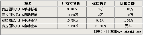 東風(fēng)悅達(dá)起亞旗下的首款兩廂轎車—賽拉圖歐風(fēng),憑借著歐洲車型的設(shè)計(jì)理念和圓潤飽滿的外形,得到消費(fèi)者的關(guān)注。近日記者了解到:賽拉圖歐風(fēng)將推出1.5排量車型,屆時(shí)1.6車型將全部停產(chǎn)。根據(jù)網(wǎng)上車市價(jià)格監(jiān)測系統(tǒng)顯示,目前銷售的賽拉圖歐風(fēng)最高優(yōu)惠1.3萬元。具體車型見下表: