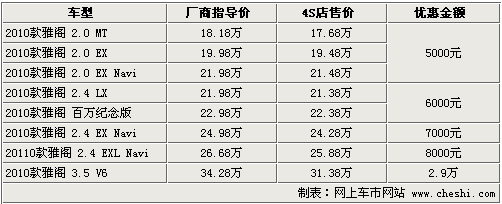 雅閣一直是中級車市場最受矚目的車型之一,棱角分明的外觀以及舒適的內(nèi)飾空間以及豪華程度成為眾多商務(wù)人士最佳選擇。廣州本田在推出2010款車型后,使雅閣整車的性價比進(jìn)一步提升。據(jù)網(wǎng)上車市價格監(jiān)測系統(tǒng)顯示:目前雅閣的優(yōu)惠幅度有所降低,最高優(yōu)惠2.9萬元。具體車型行情如下: