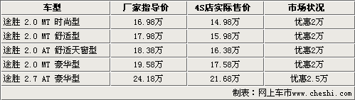 北京現(xiàn)代途勝是韓系車中非常經(jīng)典的一款城市型SUV,寬大的空間,時(shí)尚的外觀以及人性化的配置使眾多消費(fèi)者都鐘情它,從上市到現(xiàn)在在SUV市場(chǎng)中一直有著不錯(cuò)的銷量。近日根據(jù)網(wǎng)上車市價(jià)格監(jiān)測(cè)系統(tǒng)顯示,目前購(gòu)買(mǎi)現(xiàn)代途勝車型最高可以得到2.5萬(wàn)的現(xiàn)金優(yōu)惠。具體車型見(jiàn)下表: