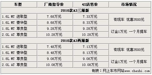 奇瑞A3是奇瑞汽車(chē)所生產(chǎn)的一款成功轉(zhuǎn)型的產(chǎn)品,自上市以來(lái)激起了廣大消費(fèi)者對(duì)自主品牌追捧的新浪潮。奇瑞A3外觀時(shí)尚、運(yùn)動(dòng),迎合時(shí)代潮流,超高的性?xún)r(jià)比造就了奇瑞A3的銷(xiāo)量直線上升。2010款奇瑞A3的表現(xiàn)也不遜色于老款產(chǎn)品,增加了更多時(shí)尚元素和實(shí)用配置。網(wǎng)上車(chē)市走訪了北京地區(qū)奇瑞4S店,得到了2010款奇瑞A3最新的市場(chǎng)消息,具體信息請(qǐng)參考下表: