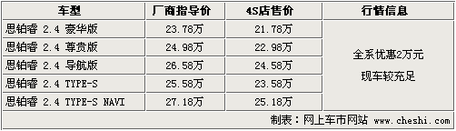 東風(fēng)本田旗下的首款運(yùn)動(dòng)中高級(jí)車型——思鉑睿于09年9月初上市,全系共計(jì)五款車型,售價(jià)為23.78萬元—27.18萬元。上根據(jù)網(wǎng)上車市價(jià)格監(jiān)測(cè)系統(tǒng)顯示,目前購買思鉑睿全系可優(yōu)惠現(xiàn)金2萬元,現(xiàn)車方面較為齊全。具體車型行情如下: