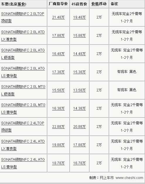 作為SONATA御翔的換代車(chē)型-----北京現(xiàn)代索納塔領(lǐng)翔于08年底正式上市銷(xiāo)售,是結(jié)合了韓國(guó)現(xiàn)代最先進(jìn)的造車(chē)技術(shù),憑借著大氣穩(wěn)重外形,寬大空間,乘坐性高,強(qiáng)勁動(dòng)力等較高的綜合性?xún)r(jià)比屹立于中級(jí)車(chē)之林。根據(jù)網(wǎng)上車(chē)市價(jià)格監(jiān)測(cè)系統(tǒng)顯示,目前領(lǐng)翔全系現(xiàn)金優(yōu)惠2萬(wàn)元,現(xiàn)車(chē)不全,具體車(chē)型需預(yù)定,具體行情如下: