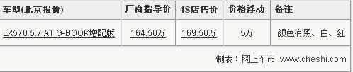 如果提到豪華SUV,大家一定首先想到寶馬X6、奔馳GL、保時(shí)捷卡宴以及路虎攬勝等豪華SUV中的“大佬”們,作為國(guó)際知名越野極強(qiáng)悍的汽車(chē)品牌,雷克薩斯的每一款車(chē)型都可謂經(jīng)典,而雷克薩斯LX570又重新詮釋了豪華SUV的新尺度,與上一代的LX470相比,你卻不得不承認(rèn)雷克薩斯的LX系列正在以跨越的方式完成自己的進(jìn)化。近日,近日根據(jù)網(wǎng)上車(chē)市價(jià)格檢測(cè)系統(tǒng)顯示,目前雷克薩斯豪華SUV-LX570加價(jià)較上段時(shí)間的10萬(wàn)元較少了一半,僅加價(jià)5萬(wàn)進(jìn)行銷(xiāo)售,而且有現(xiàn)車(chē)供應(yīng),具體情況請(qǐng)參照下表: