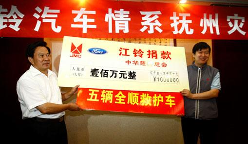 江鈴股份公關(guān)及法務(wù)部部長(zhǎng)丁朝陽(yáng)代表江鈴汽車(chē)股份有限公司將5輛福特全順救護(hù)車(chē)鑰匙和100萬(wàn)元人民幣交給撫州市慈善總會(huì)代表?yè)嶂菔惺形N、常?wù)副市長(zhǎng)謝發(fā)明手中