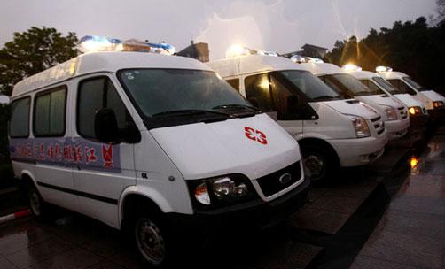江鈴緊急趕制的5輛福特全順救護(hù)車(chē)一到達(dá)災(zāi)區(qū),立即被派往受災(zāi)前線(xiàn)救護(hù)受災(zāi)民眾
