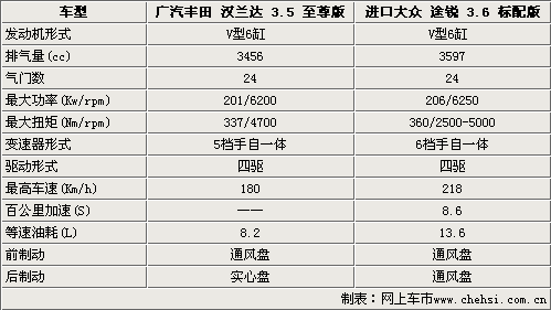 這兩款SUV車型均搭載的是V型6缸發(fā)動機,排量都在3.5升這個區(qū)間。但是在發(fā)動機技術上卻存在著本質(zhì)區(qū)別。廣汽豐田漢蘭達的發(fā)動機配備了雙VVT-i技術,實現(xiàn)了卓越的動力輸出,同時進一步提高了燃油經(jīng)濟性。進口大眾途銳則配備的是動力更加突出FSI發(fā)動機,該發(fā)動機采用燃油缸內(nèi)直噴技術,這一點從最大功率和最大扭矩的輸出就可以看出。在變速器方面途銳則是略勝一籌,配備了6速手自一體變速箱,令變速更平滑順暢,該變速器還帶有DSP的智能動力換檔系統(tǒng),能辨認出您的變速習慣,使駕駛員充分享受到駕駛的樂趣。進口大眾途銳剎車系統(tǒng)采用的是散熱性能良好的前后通風盤,漢蘭達采則采用的是前通風后實心。