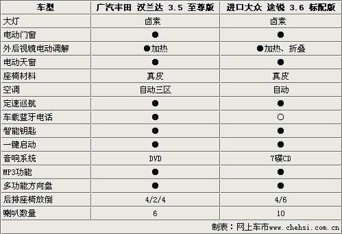 廣汽豐田漢蘭達和進口大眾途銳的舒適配置可謂是應有盡有,電動天窗、真皮座椅、自動空調(diào)、定速巡航、多功能方向盤等設備都成為了標準配置。比較遺憾的是進口大眾途銳這個級別的車型沒有配備DVD系統(tǒng)只是配備的7碟CD,但是10個揚聲器的音樂效果,可以讓乘員充分體會到音樂的樂趣。漢蘭達的車載電話系統(tǒng)減少了駕駛者在行駛中尋找電話的麻煩。在后排放倒比例上,漢蘭達最為靈活多變,放倒比例達到了4:2:4,可以更加有效的方便乘客置放大件物品,進口大眾途銳后排座椅則可以按4:6的比例折疊。