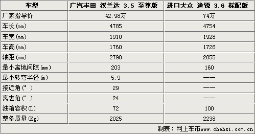 廣汽豐田漢蘭達和進口大眾途銳均屬于一個級別的城市SUV車型,我們選取的兩款車型均是3.5排量這個級別的車型,但是在售價方面卻相差了31萬元。在車身尺寸方面,國產(chǎn)漢蘭達在車長、車高、均超過了進口大眾途銳,這一點保證了其內(nèi)部頭部空間的寬敞。在軸距方面,進口大眾途銳要比廣汽豐田漢蘭達長出了65mm,這一點意味著途銳的腿部空間將會優(yōu)越于漢蘭達。在越野性能方面,從上表數(shù)據(jù)可以看出漢蘭達的離地間隙分別達到了203mm,接近角和離去角分別達到了29°和24°,這樣的參數(shù)應該可以滿足一般的越野路況。越野方面進口大眾途銳沒有提供越野參數(shù)數(shù)據(jù)。進口大眾途銳的油箱達到了100升,使您完全沒必要去考慮長途旅行沒油的問題。