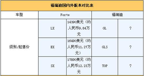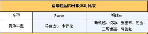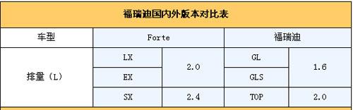 總結(jié):從上面的對比我們發(fā)現(xiàn),F(xiàn)orte國內(nèi)外兩種版本之間的差異還是很大的,其中動力單元差別最顯著,這主要是由國情和消費能力所決定的。目前國內(nèi)市場上小排量車型大行其道,尤其是1.6L車型更是炙手可熱,福瑞迪今后的重點也將會落在1.6L車型上,至于2.0L車型更多的將擔(dān)負(fù)起拉升品牌形象的重任。具體價格車型配置等信息,我們將在上市第一時間為你詳細(xì)報道,敬請大家關(guān)注!