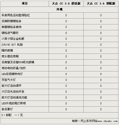 從外觀上看,大眾CC 3.6舒適版和頂配版沒有任何區(qū)別。車身同色運動型保險杠、車身鍍鉻裝飾條、235/45 R17大尺寸輪胎、外后視鏡集成LED轉向燈以及雙氙氣大燈帶自動清洗裝置均出現(xiàn)在兩款車型上。