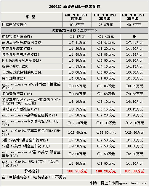 新上市的奧迪A8L 3.0FSI主打性價比,在標準配置上要高于奧迪A8L 2.8FSI。在選裝配置上,價格略低的基本型以及豪華型可以選裝所提供的全部的配置,總價均超過了百萬元。而售價接近百萬元的尊貴型除了價值1.4萬元的“電視接收系統(tǒng)”為標準配置外不必選裝,其余配置均需要選裝。