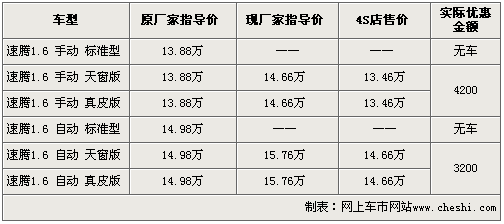 速騰作為一汽大眾新一代“A級”車生產(chǎn)平臺的產(chǎn)物,上市當初憑借全系車型標配ESP電子穩(wěn)定程序而成為統(tǒng)計標桿。隨著國家對1.6及以下排量車型減免一半購置稅政策的出臺,速騰1.6車型更受到消費者的追捧。據(jù)網(wǎng)上車市價格監(jiān)測系統(tǒng)顯示,速騰1.6排量全系車型廠家指導價格上調(diào),優(yōu)惠幅度降低。相關(guān)車型及價格如下表所示: