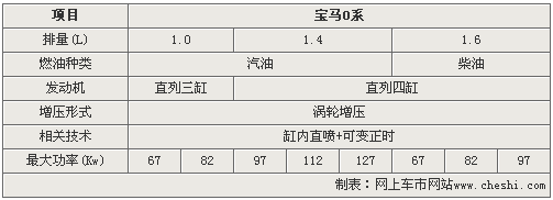 寶馬0系作為寶馬首款超緊湊型延續(xù)精準(zhǔn)操控的同時(shí),搭載了多款小排量渦輪增壓汽油和柴油引擎。其中由于發(fā)動(dòng)機(jī)調(diào)教和電腦匹配的不同,1.0和1.4渦輪增壓汽油引擎可分別調(diào)出兩款和三款不同的最大功率引擎。而1.6渦輪增壓柴油引擎,也可以分別調(diào)出67Kw、82 Kw和97 Kw三種不同的最大功率。小排量渦輪增壓引擎的運(yùn)用,不僅可以提升寶馬0系動(dòng)力性能,而且也進(jìn)一步降低了整車油耗。