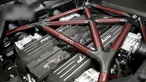 打開背部的引擎蓋,可以發(fā)現(xiàn)一個印有DMC字樣的紅色碳纖加強(qiáng)架,在加強(qiáng)架下的V12引擎經(jīng)過重新DMC的ECU刷寫后,馬力提升至670匹的水平。經(jīng)過測速,這臺Quattro Veloce在0-96的加速時間只需3.2秒,可見Murcielago強(qiáng)大的改裝潛力。