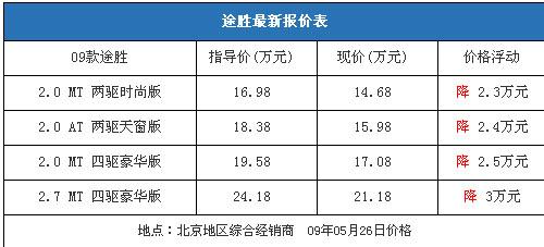 近期國內(nèi)市場SUV車型再次升溫,4月份銷量較上月有大幅增加,其中途勝4月份銷量高達4050輛,排在SUV銷量榜第四位。我們從北京地區(qū)的一家北京現(xiàn)代綜合經(jīng)銷商處了解到,09款途勝全系車型的優(yōu)惠在2.3-3萬元區(qū)間,價格和三月初基本相同,只有2.7手動四驅(qū)豪華型的價格比月初下降了2000元,優(yōu)惠金額增加到了3萬元。以下是09款途勝最新詳細(xì)報價表: