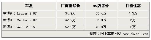 據(jù)4S店銷(xiāo)售人員介紹:目前薩博9-3現(xiàn)車(chē)較充足,最高優(yōu)惠可達(dá)6萬(wàn)元,標(biāo)準(zhǔn)型薩博9-3目前優(yōu)惠4.5萬(wàn)。如需訂購(gòu)顏色較少的車(chē),等待時(shí)間在1-2周左右。