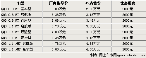 今年年初,奇瑞汽車正式推出了QQ3啟航版,共有三款車型,售價3.38-4.78萬元。奇瑞QQ3啟航版是在原有車型的基礎(chǔ)上增加更多使用配置,而價格方面也與原車型基本保持一致。奇瑞推出的QQ3啟航版使該系列車型在性價比方面進(jìn)一步提高。據(jù)網(wǎng)上車市網(wǎng)站價格監(jiān)測系統(tǒng)顯示,奇瑞QQ3目前出現(xiàn)了一定的優(yōu)惠幅度。
