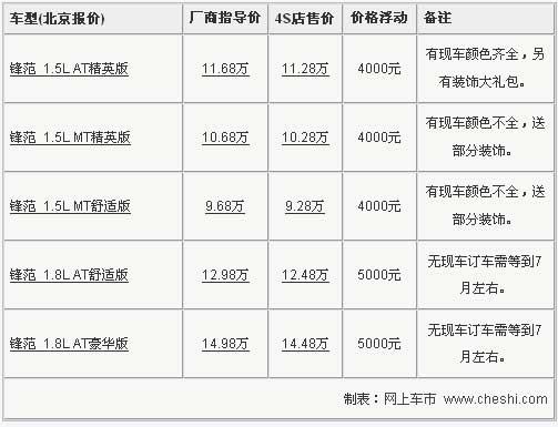 據(jù)廣汽本田4S店銷售人員介紹,目前鋒范有3千元-5千元不等的優(yōu)惠,另外近期購車還將贈送部分裝飾,包括腳墊、座套等可供消費(fèi)者選擇。現(xiàn)車方面主要以1.5L車型為主,部分顏色及1.8L車型需要提前預(yù)訂,預(yù)訂訂金為1000元,7月左右可以提到現(xiàn)車。北京地區(qū)各4S店由于訂單不同,各店銷售的現(xiàn)車顏色有所不同。