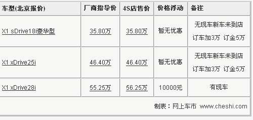 據(jù)寶馬4S店銷售人員介紹:目前寶馬X1共有三款車型,如消費者預(yù)訂這3款車型,訂金統(tǒng)一為5萬元。寶馬X1 28目前有現(xiàn)車,但提車需加價1萬元。18i及25i目前無現(xiàn)車,購車需加價3萬元。由于X1現(xiàn)車較少,所以預(yù)定需等時間較長。