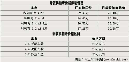 與此同時(shí),2010年開始進(jìn)口雪佛蘭科帕奇在北京市場(chǎng)的售價(jià)都以穩(wěn)定的優(yōu)惠幅度進(jìn)行銷售。例如2.4升車型普遍優(yōu)惠一萬(wàn)元,實(shí)際售價(jià)僅為21.48-25.58萬(wàn);3.2升旗艦車型為30.28萬(wàn)優(yōu)惠幅度達(dá)到7萬(wàn)元。那么現(xiàn)款科帕奇在優(yōu)惠后的價(jià)格區(qū)間也恰好與內(nèi)部人士透露的新款車型上市后的價(jià)位區(qū)間相近。
