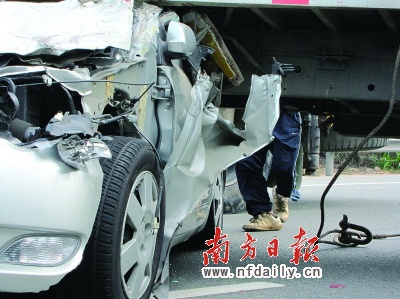 比亞迪轎車上的林先生告訴記者,他們是廣東湛江人,昨天他帶著女朋友和親戚乘坐侄子的小車回老家準備結(jié)婚。沒想到侄子脾氣不太好,看到貨車司機在前邊的快車道上不急不慢地行駛,一時急于超車,結(jié)果不小心發(fā)生了撞車,侄子的眉骨被撞裂,傷勢稍微嚴重一些,其他人則是不同程度的輕傷。